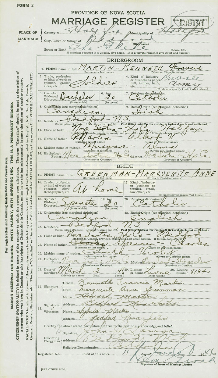 28. Date of marriage March 2 1946 29. By license or banns License 30. License number 81340