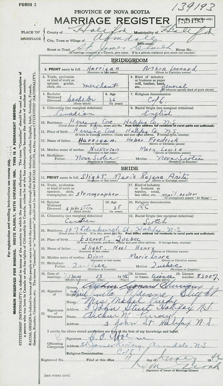28. Date of marriage May 13 1946 29. By license or banns License 30. License number 82007
