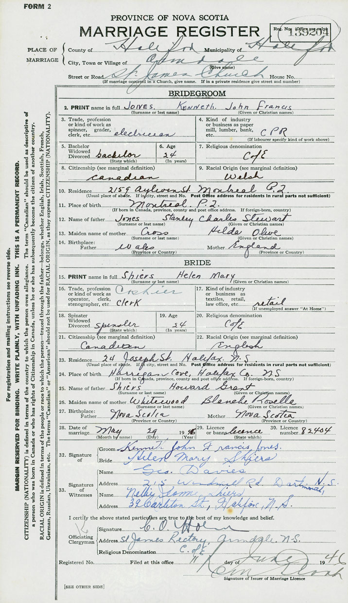 28. Date of marriage May 29 1946 29. By license or banns License 30. License number 82404
