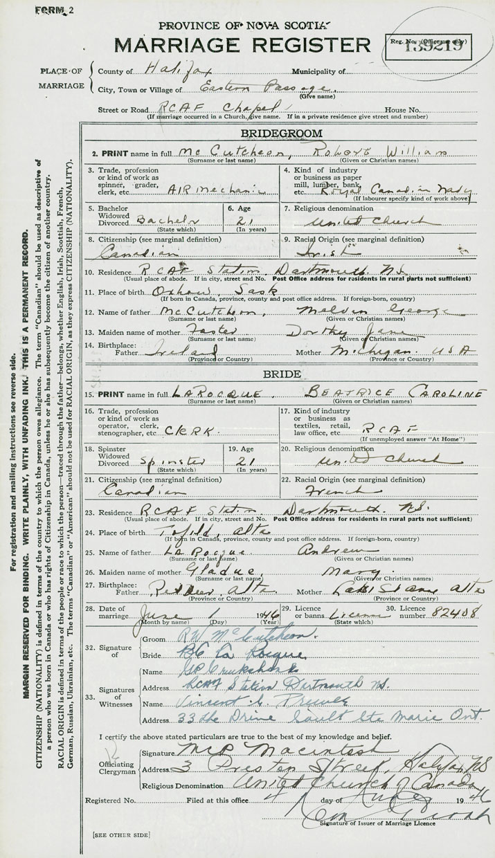 28. Date of marriage June 1 1946 29. By license or banns License 30. License number 82408