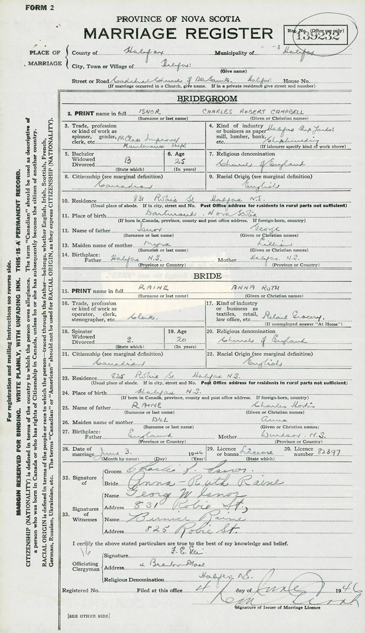 28. Date of marriage June 3 1946 29. By license or banns License 30. License number 82397