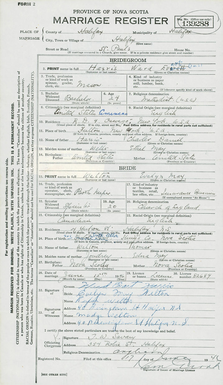 28. Date of marriage June 15 1946 29. By license or banns License 30. License number 82684