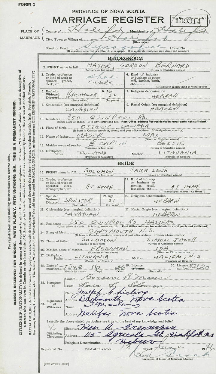 28. Date of marriage June 16 1946 29. By license or banns License 30. License number 82620