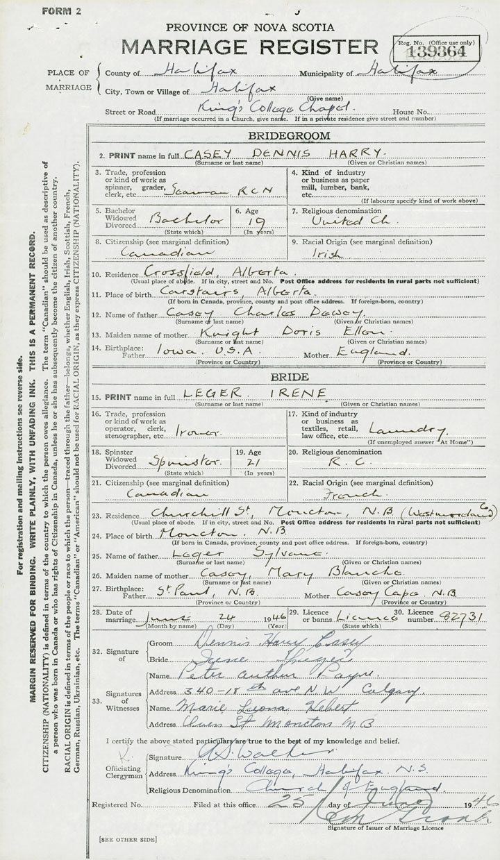 28. Date of marriage June 24 1946 29. By license or banns License 30. License number 82731