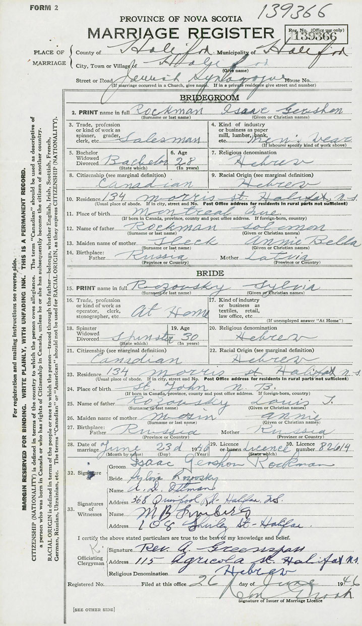 28. Date of marriage June 23 1946 29. By license or banns License 30. License number 82614
