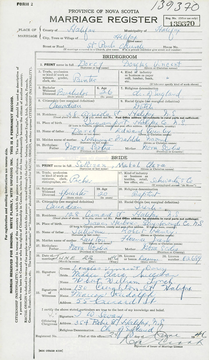 28. Date of marriage June 22 1946 29. By license or banns License 30. License number 82689