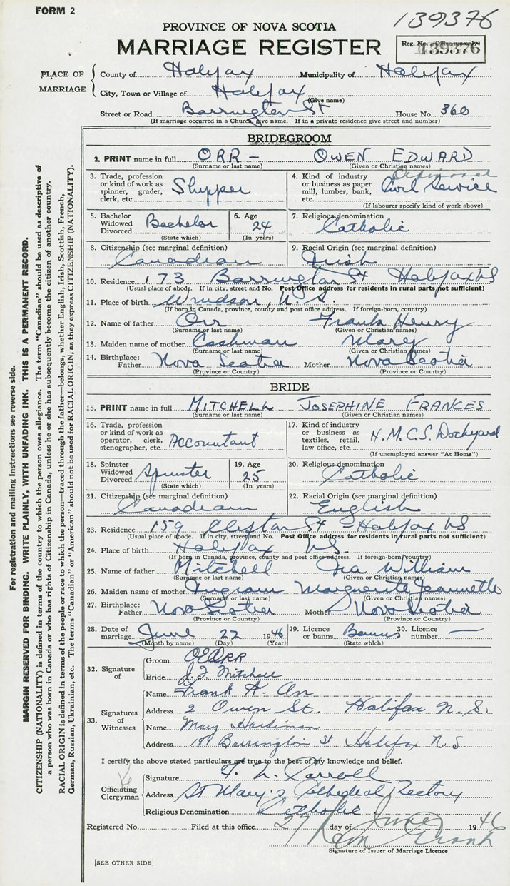 28. Date of marriage June 22 1946 29. By license or banns License 30. License number