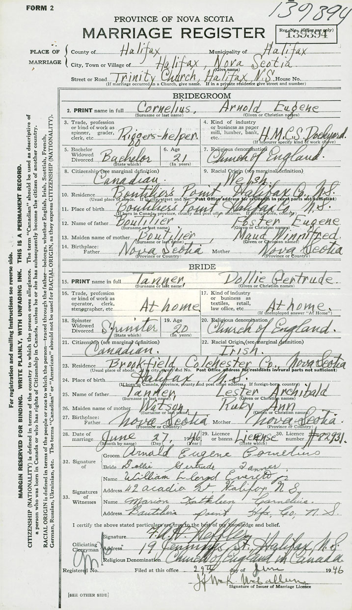 28. Date of marriage June 27 1946 29. By license or banns License 30. License number 82931