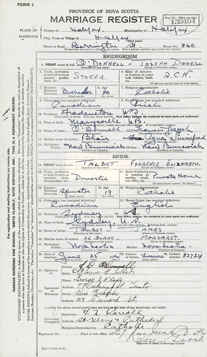 28. Date of marriage June 25 1946 29. By license or banns License 30. License number 82724