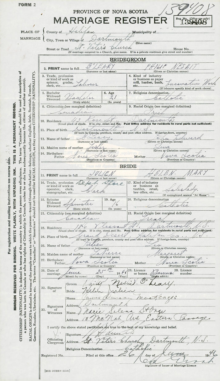 28. Date of marriage June 25 1946 29. By license or banns License 30. License number