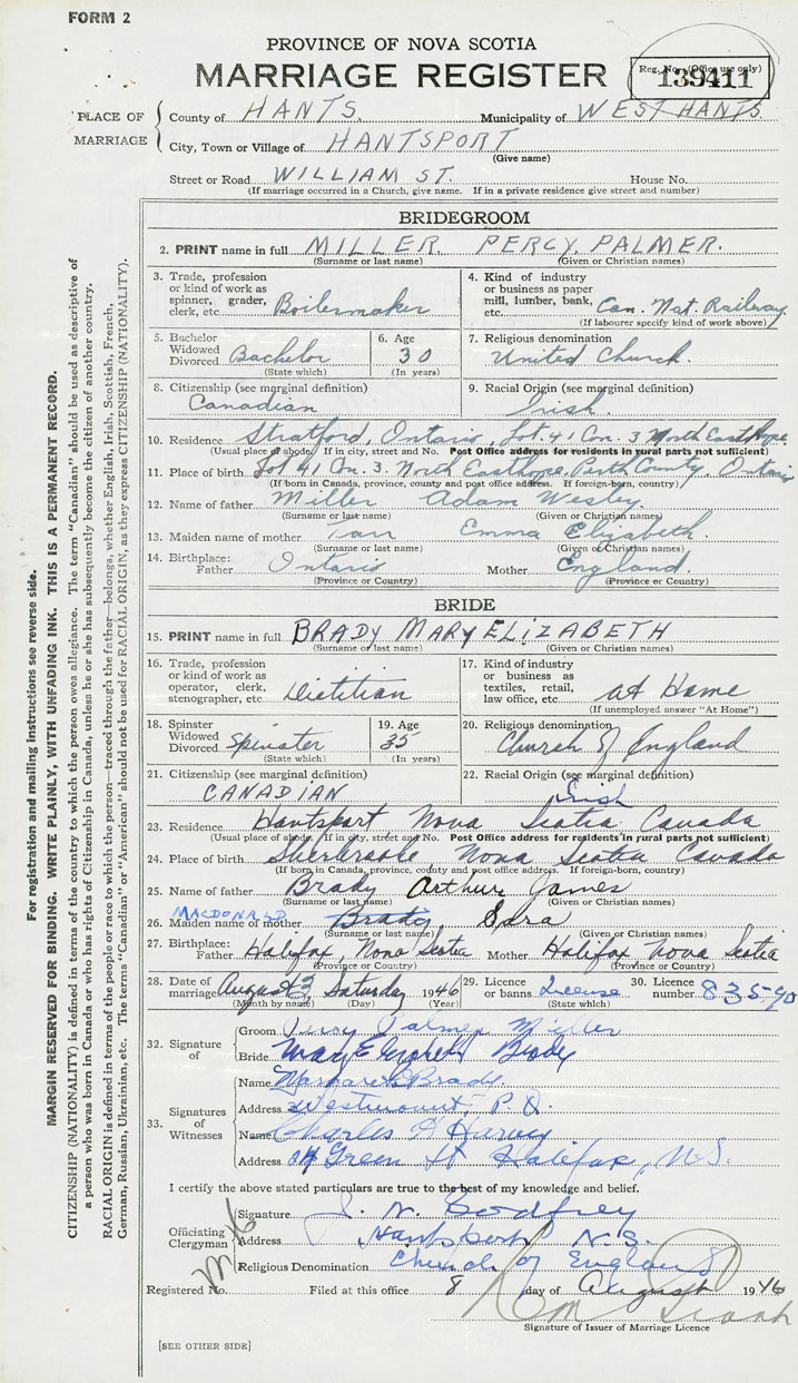 28. Date of marriage August 3 1946 29. By license or banns License 30. License number 83590