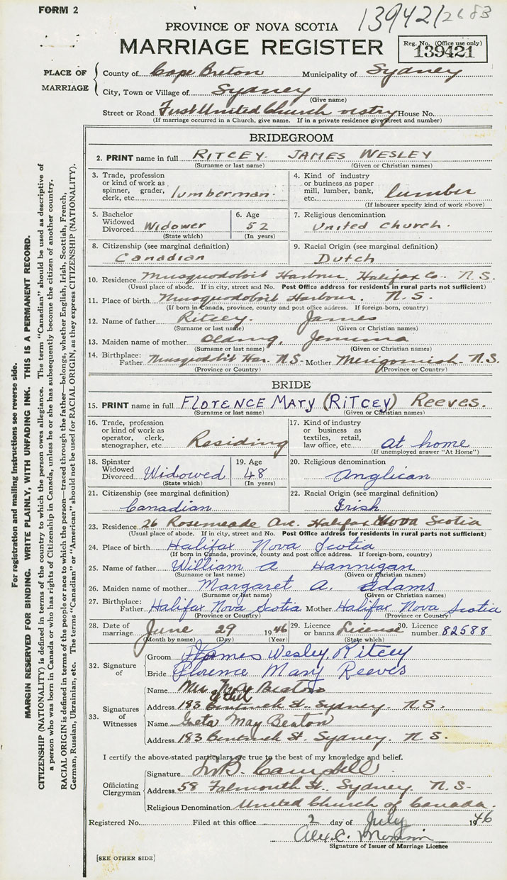 28. Date of marriage June 29 1946 29. By license or banns License 30. License number 82588