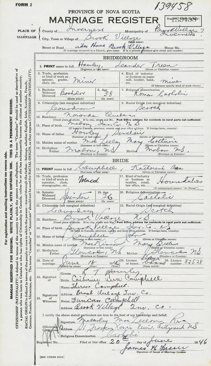 28. Date of marriage June 18 1946 29. By license or banns License 30. License number 82528