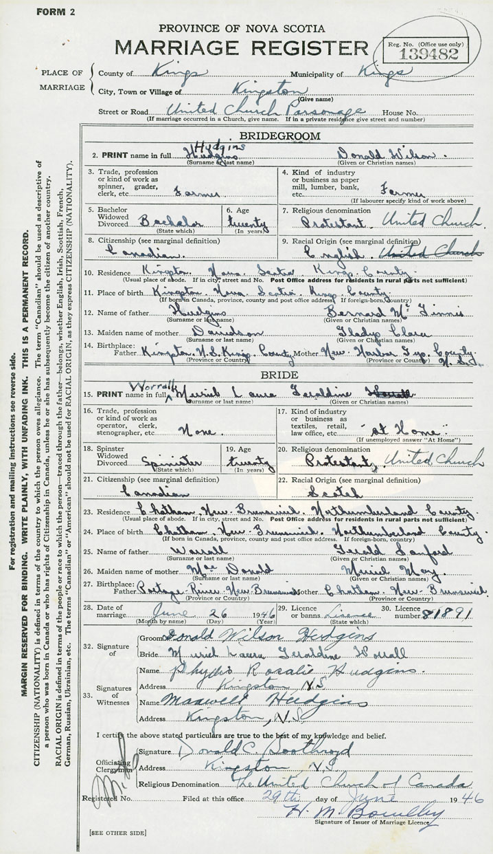 28. Date of marriage June 26 1946 29. By license or banns License 30. License number 81891