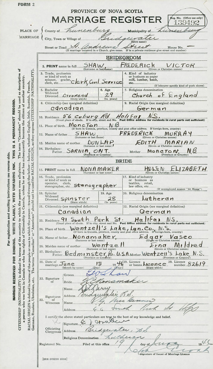 28. Date of marriage June 15 1946 29. By license or banns License 30. License number 82619