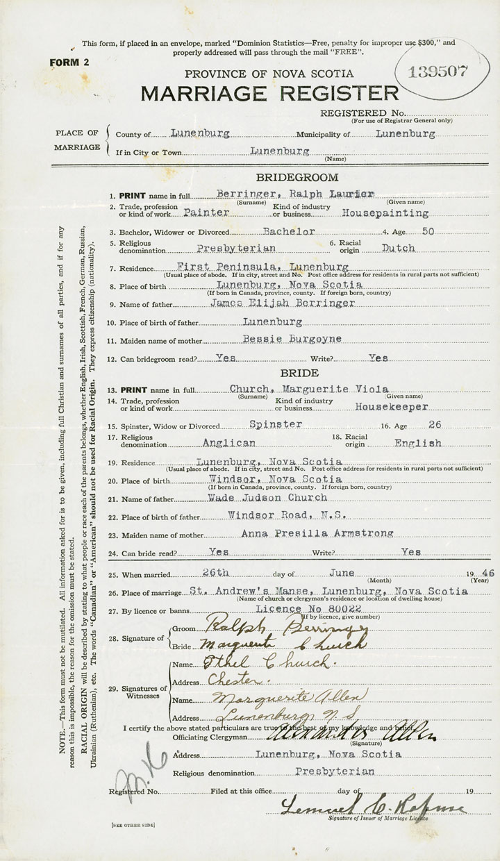 PLACE OF MARRIAGE County of Lunenburg in City or Town Lunenburg