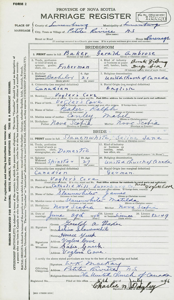 28. Date of marriage June 29 1946 29. By license or banns License 30. License number 82149