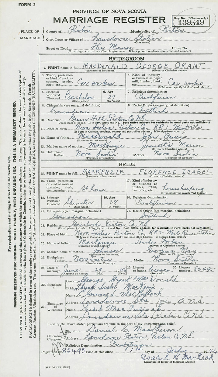 28. Date of marriage June 29 1946 29. By license or banns License 30. License number 82495