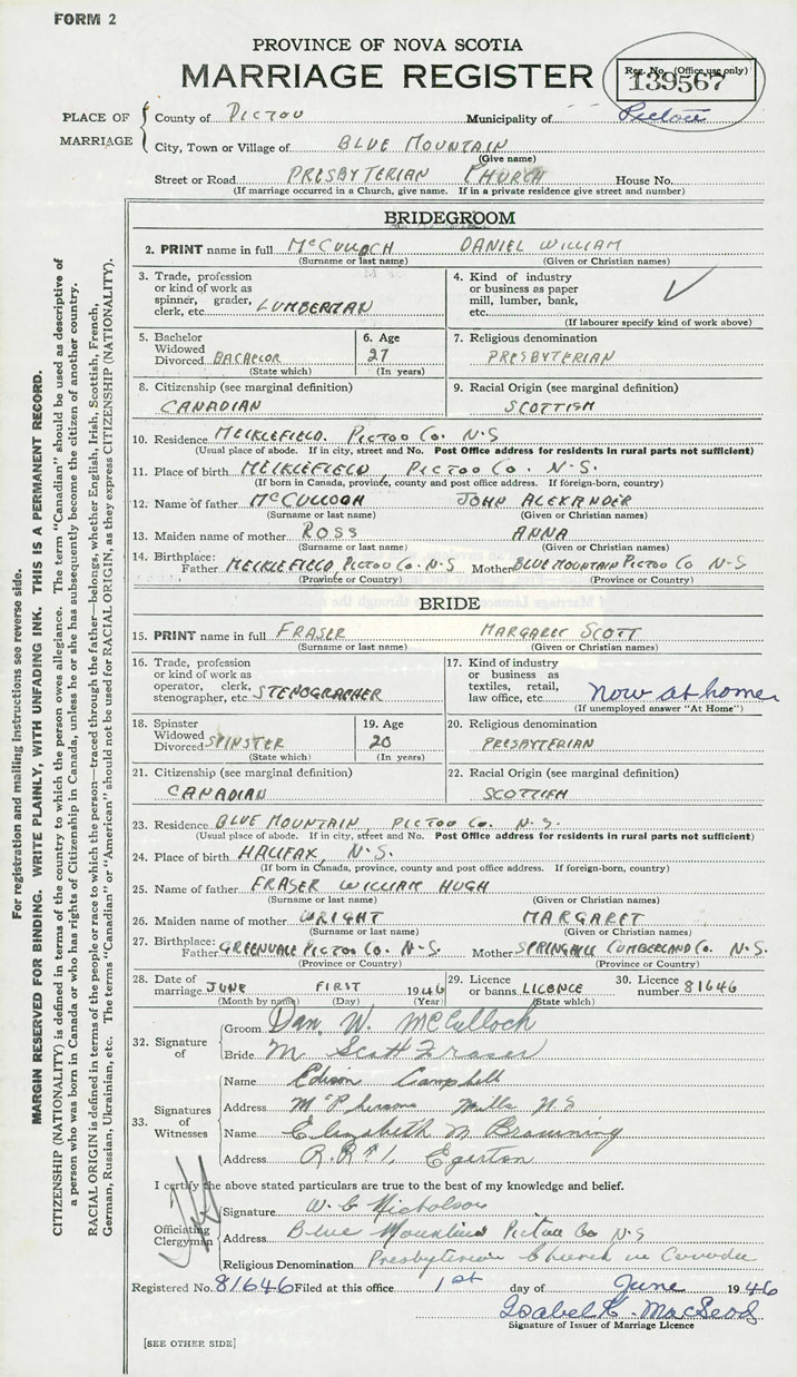 28. Date of marriage June 1 1946 29. By license or banns License 30. License number 81646