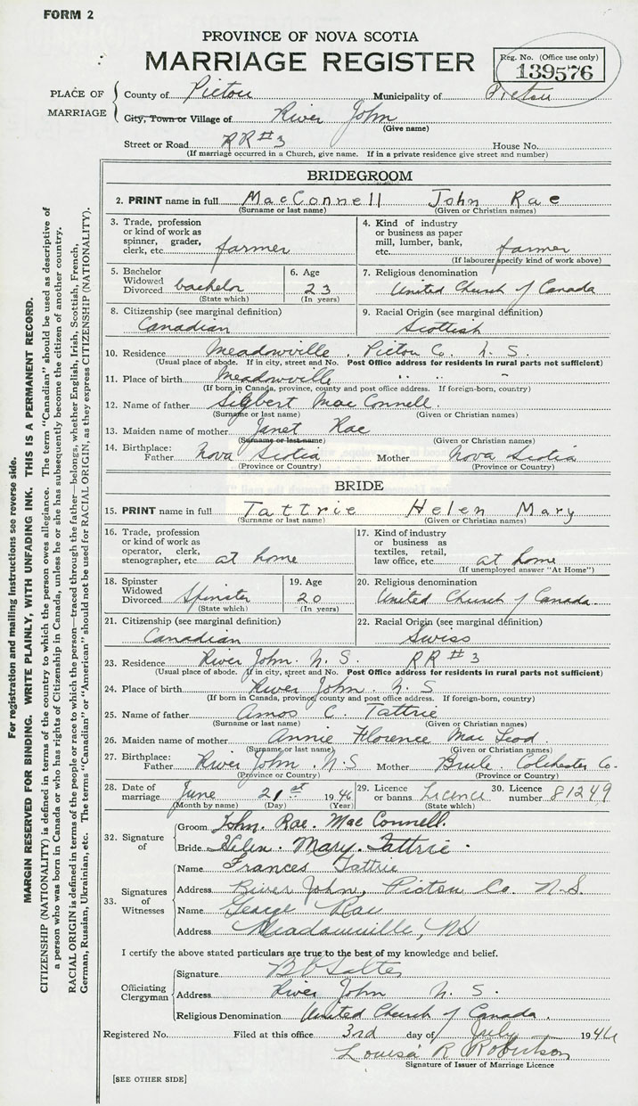 11. Place of birth Nova Scotia, Pictou County, Meadowville
