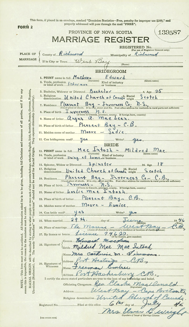 PLACE OF MARRIAGE County of Cumberland in City or Town West Bay