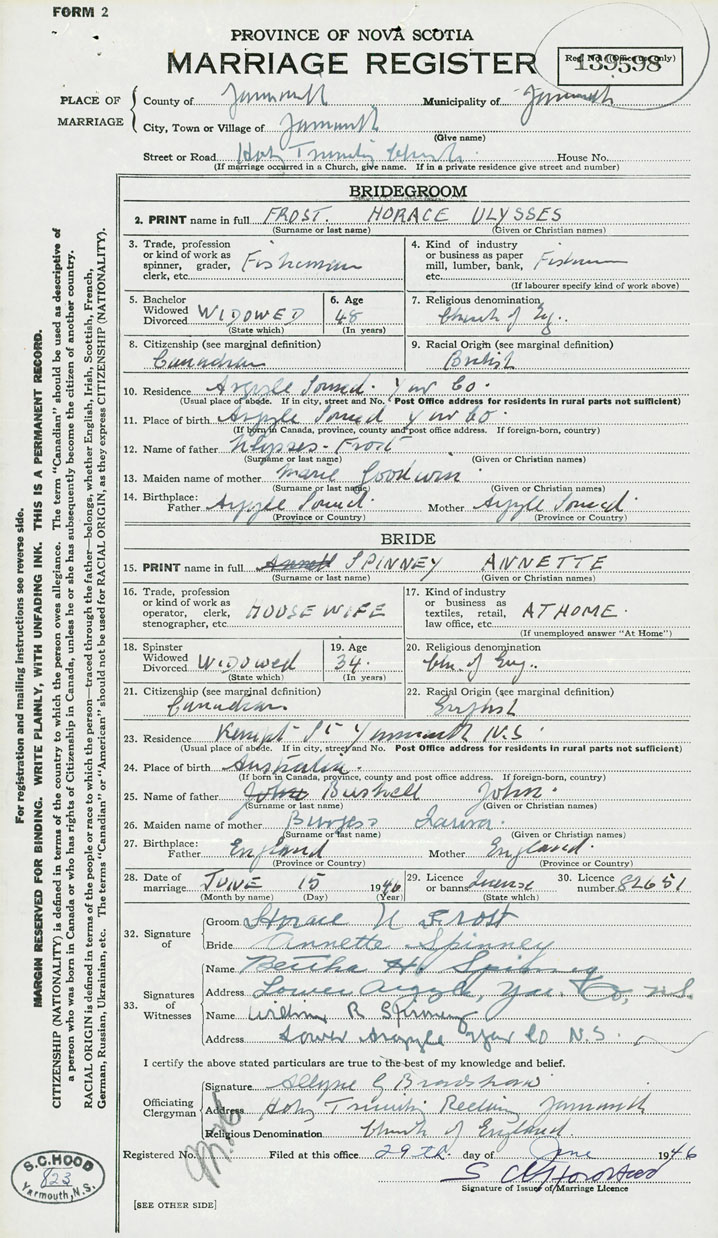PLACE OF MARRIAGE County of Yarmouth