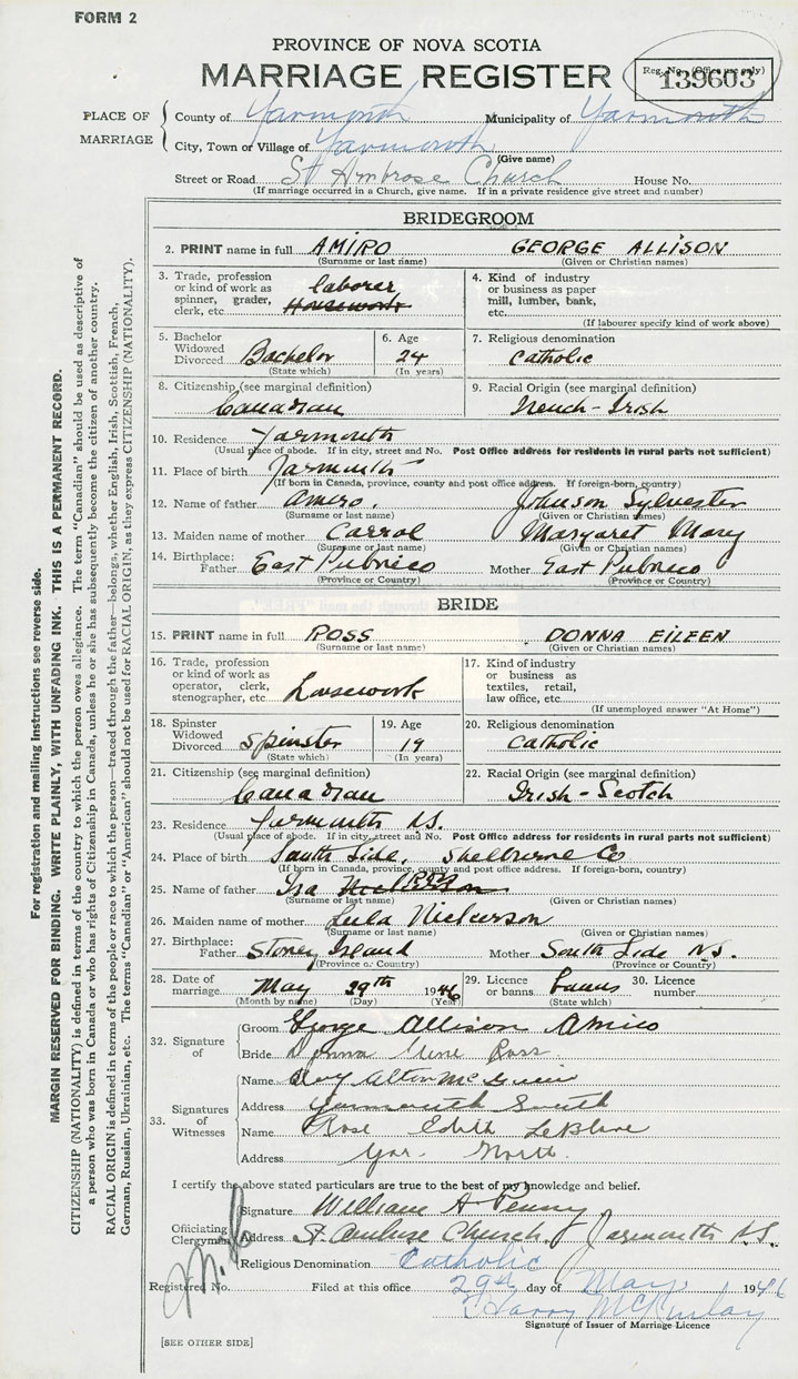 28. Date of marriage May 29 1946 29. By license or banns License 30. License number