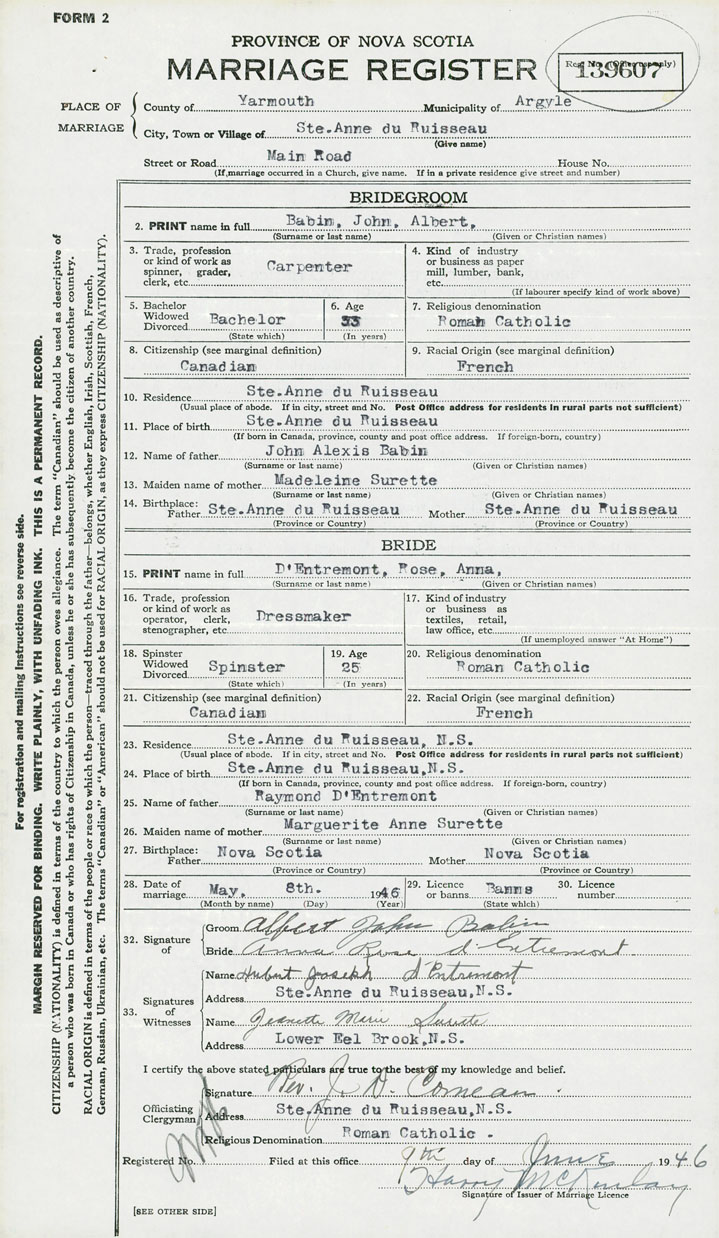 24. Place of birth Ste. Anne du Ruisseau, Yarmouth County