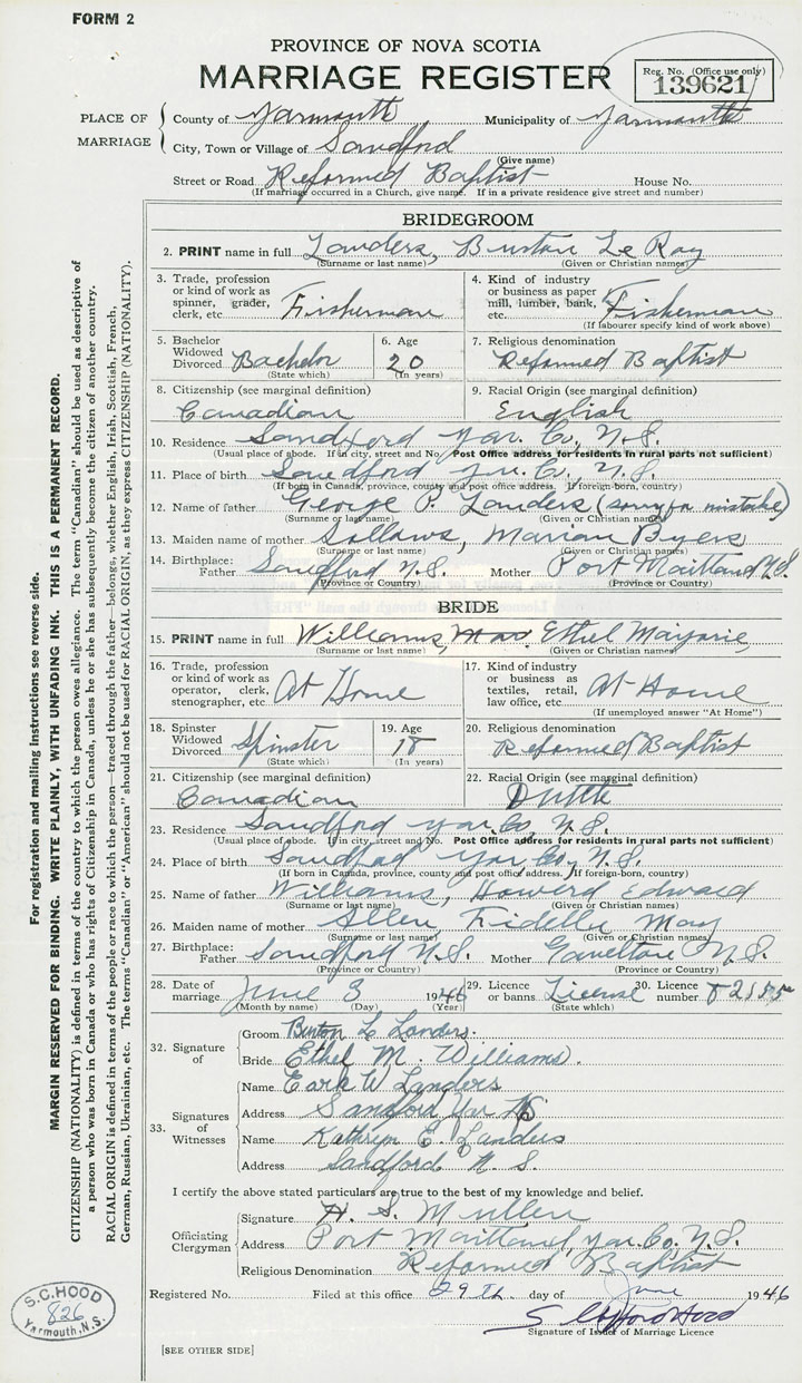 24. Place of birth Sandford, Yarmouth County
