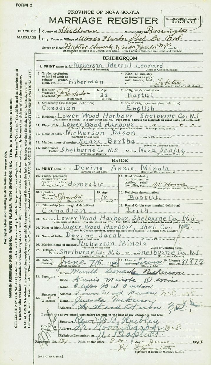 24. Place of birth Lower Wood Harbour, Shelburne County