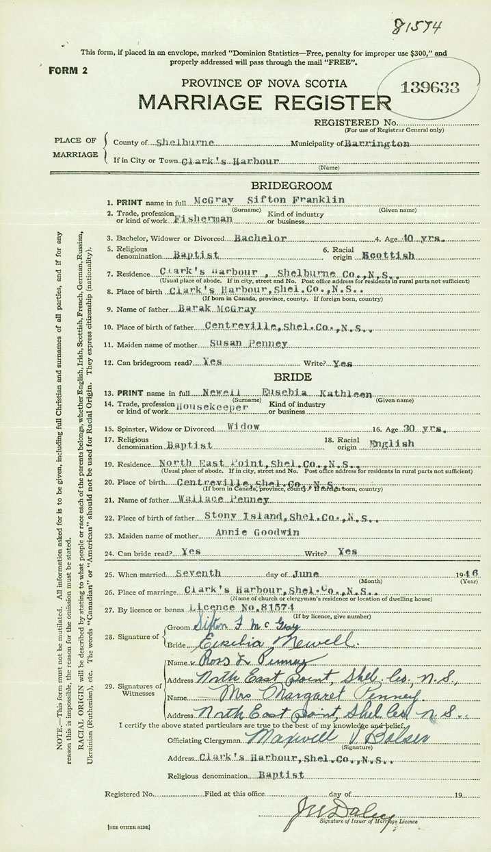PLACE OF MARRIAGE County of Shelburne in City or Town Clarks Harbour