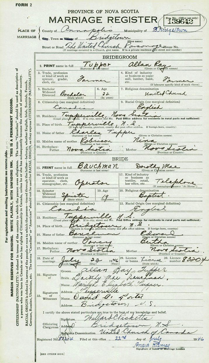 28. Date of marriage July 22 1946 29. By license or banns License 30. License number 83204