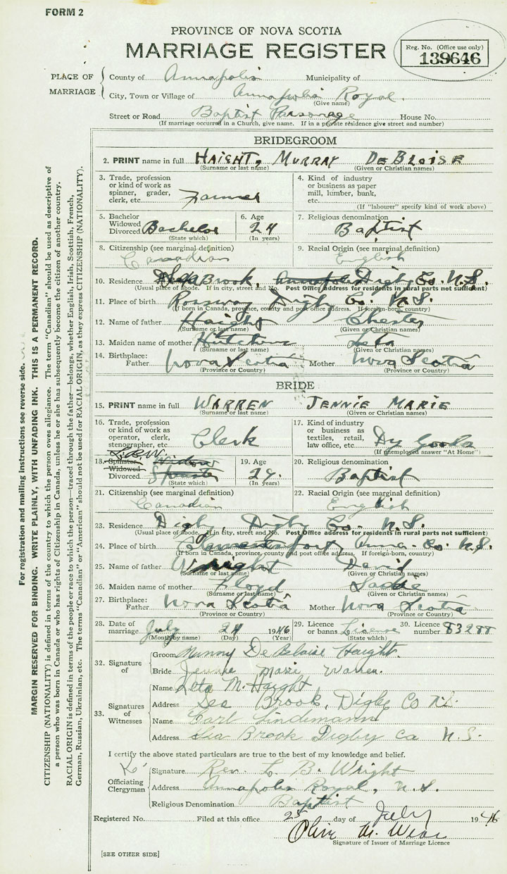 28. Date of marriage July 24 1946 29. By license or banns License 30. License number 83288