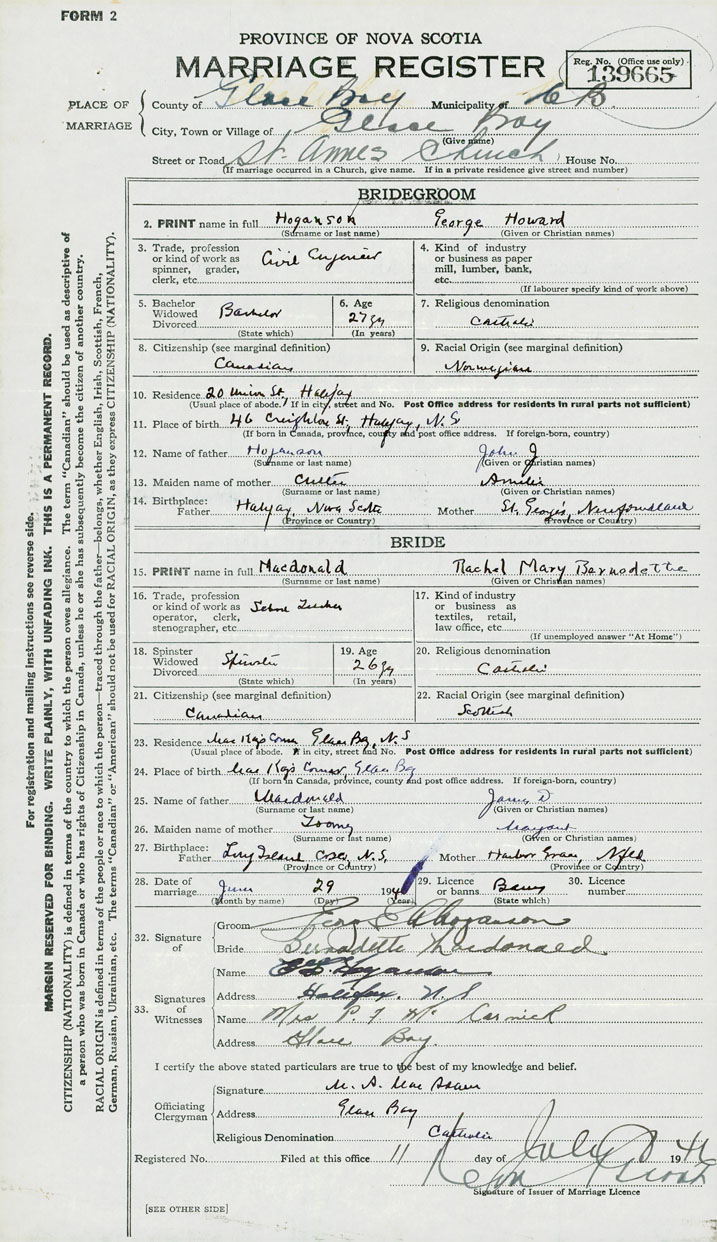 24. Place of birth MacKay's Corner, Glace Bay