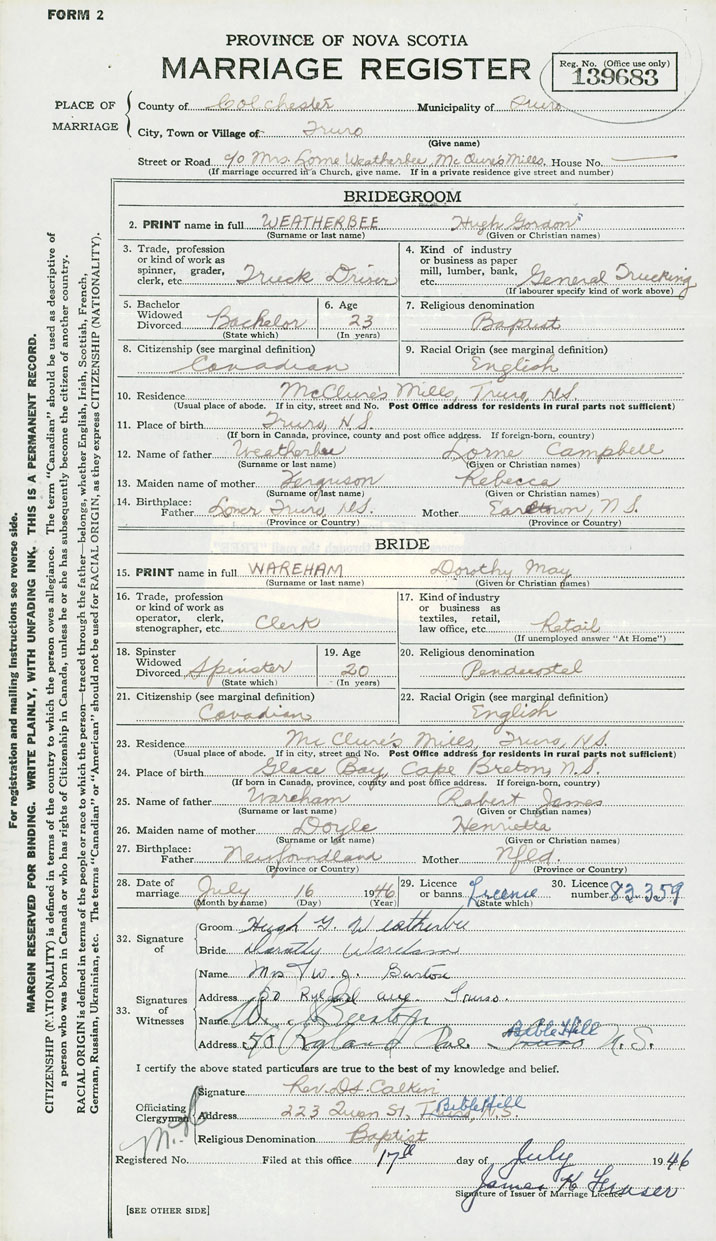 28. Date of marriage July 16 1946 29. By license or banns License 30. License number 83359
