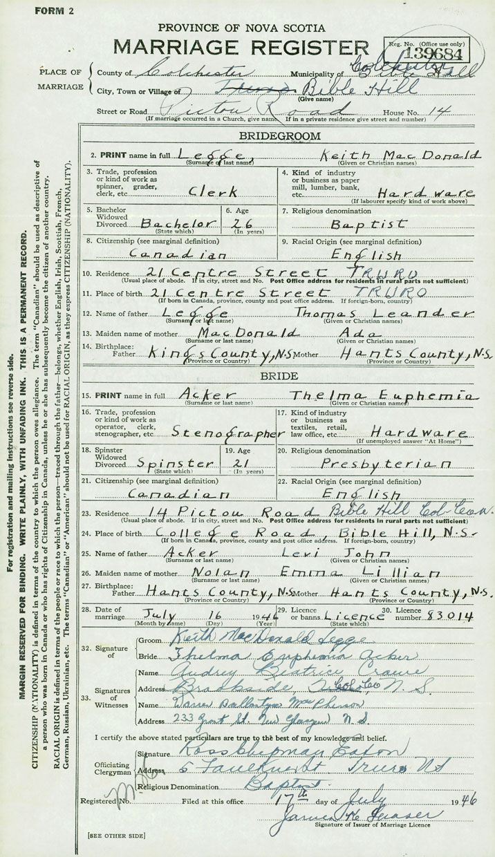 28. Date of marriage July 16 1946 29. By license or banns License 30. License number 83014