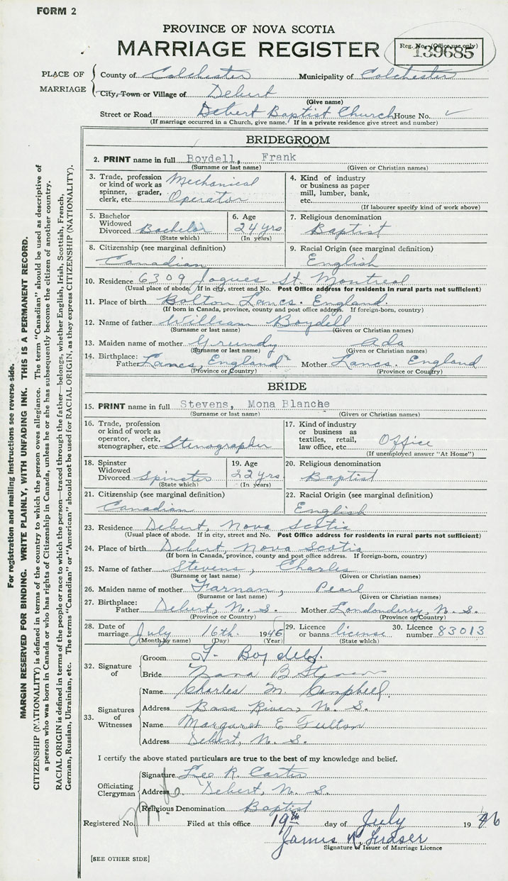 28. Date of marriage July 16 1946 29. By license or banns License 30. License number 83013