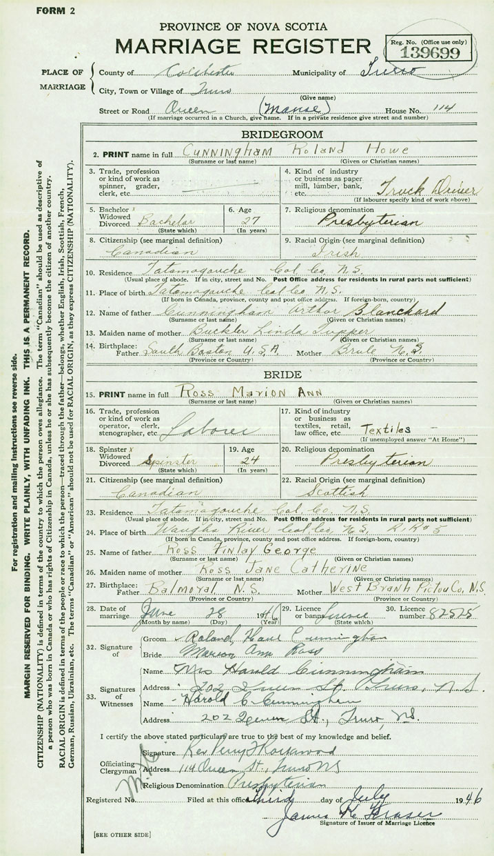 28. Date of marriage June 28 1946 29. By license or banns License 30. License number 82525