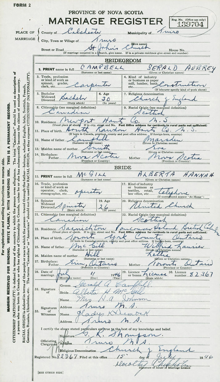 28. Date of marriage July 11 1946 29. By license or banns License 30. License number 82367