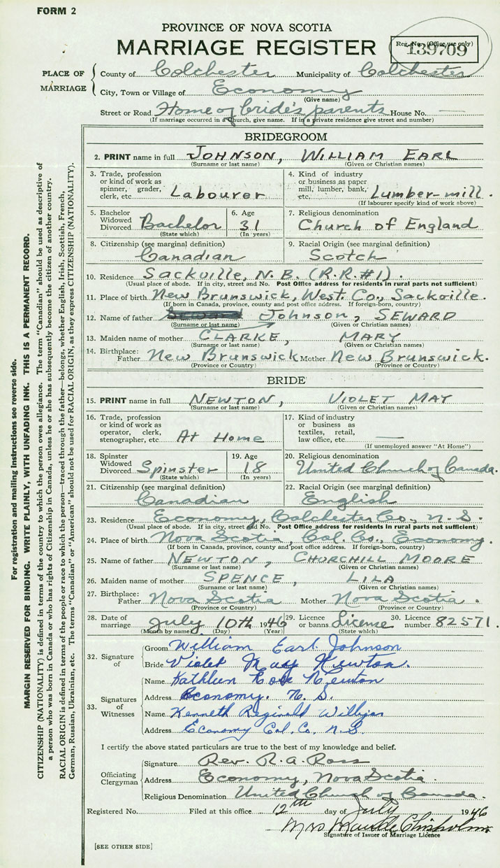 28. Date of marriage July 10 1946 29. By license or banns License 30. License number 82571