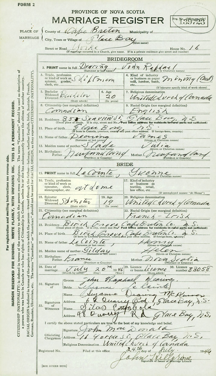 28. Date of marriage July 20 1946 29. By license or banns License 30. License number 83058