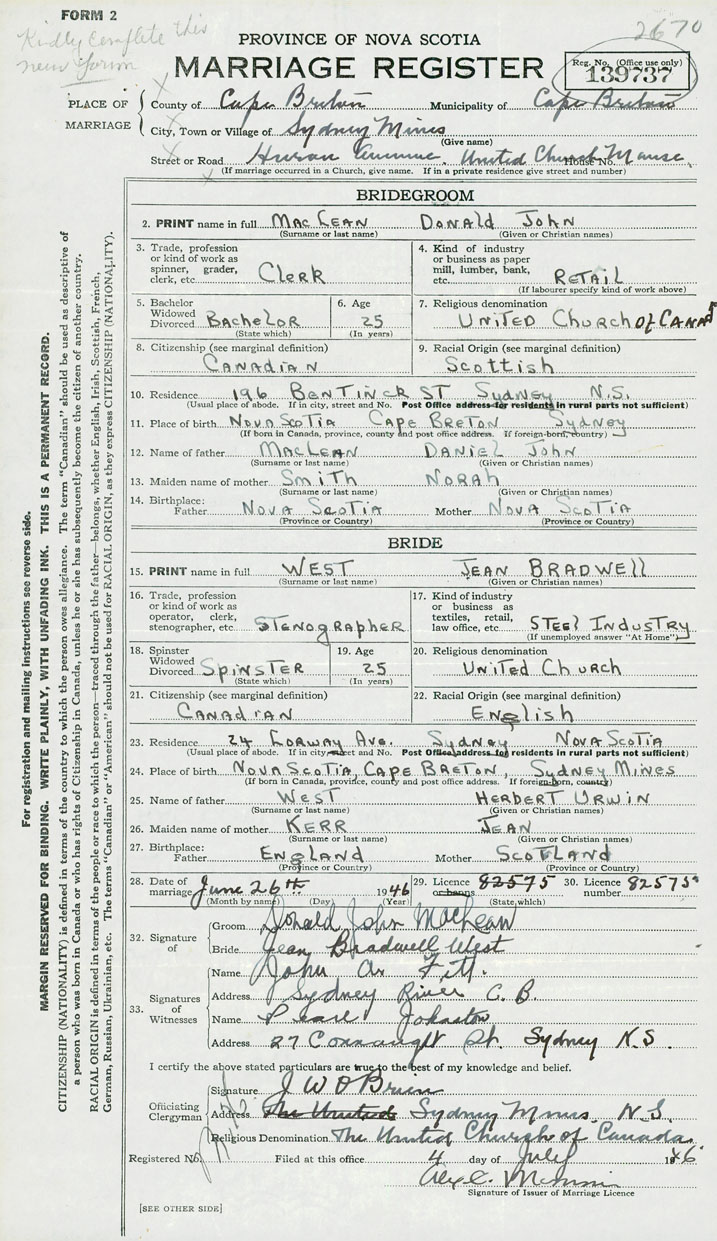 28. Date of marriage June 26 1946 29. By license or banns License 30. License number 82575