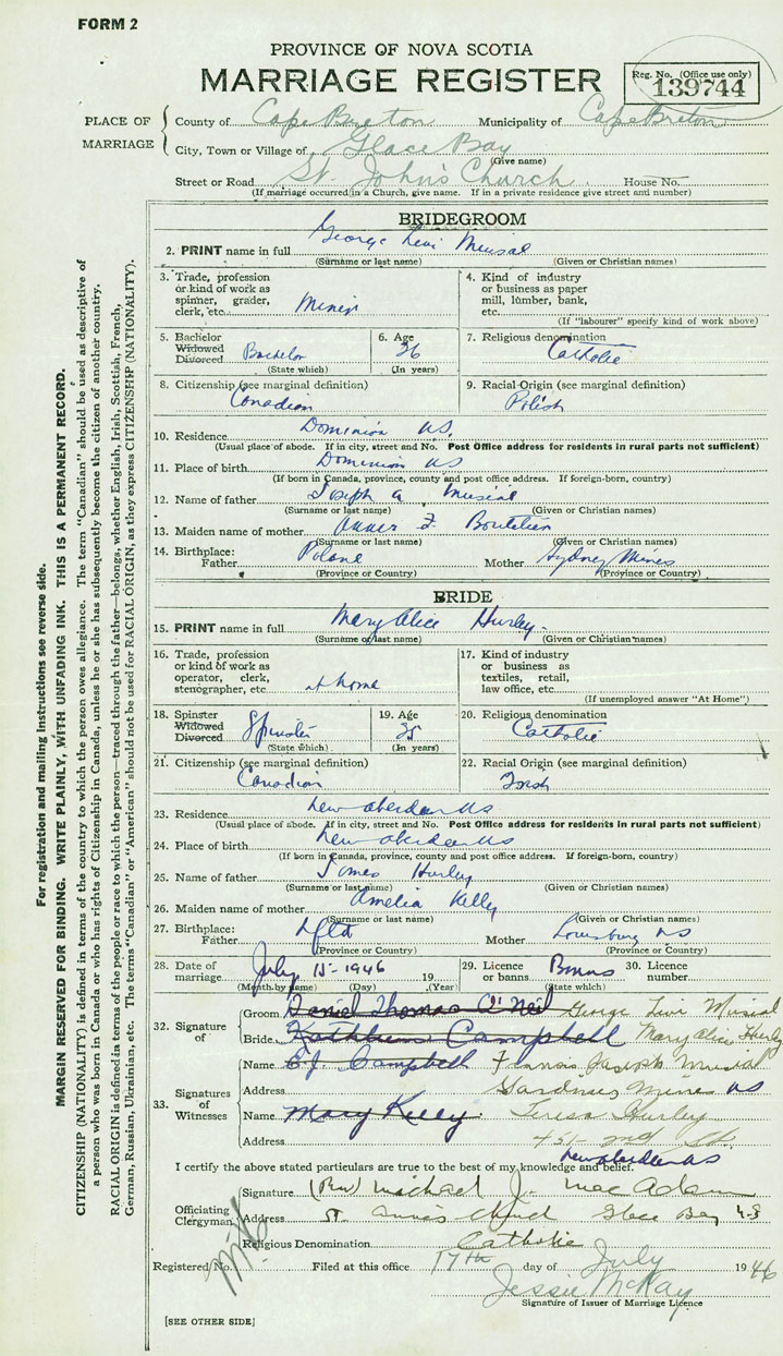 28. Date of marriage July 15 1946 29. By license or banns License 30. License number