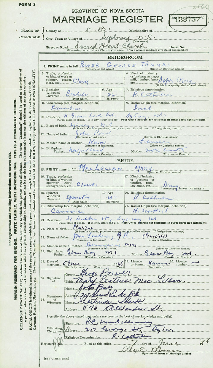 27. Birthplace Father Glace Bay Mother Glace Bay