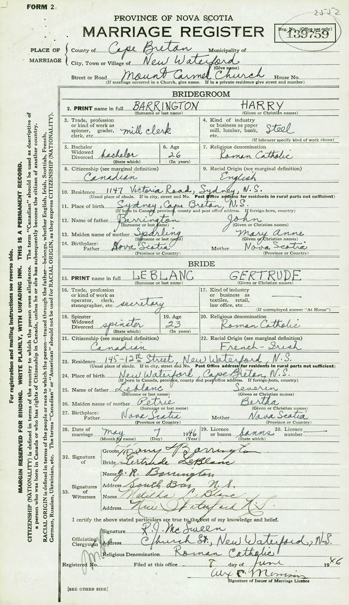 28. Date of marriage May 7 1946 29. By license or banns License 30. License number