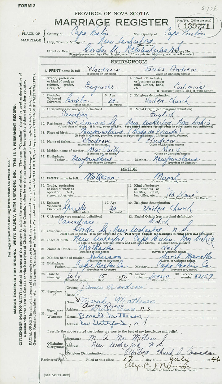 28. Date of marriage July 15 1946 29. By license or banns License 30. License number 83159