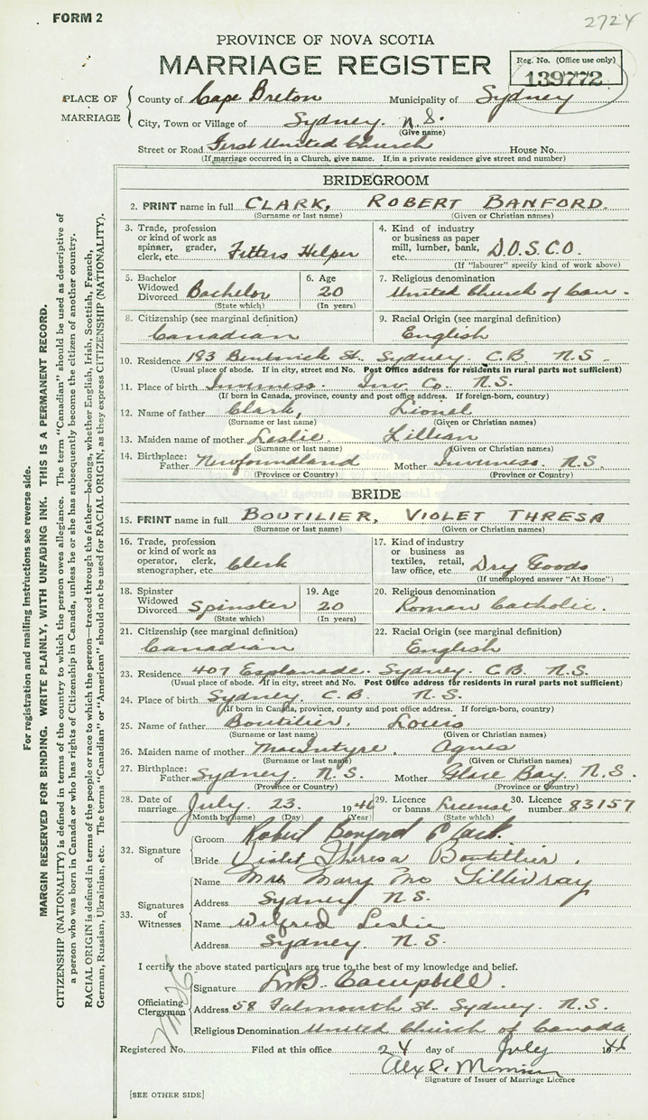28. Date of marriage July 23 1946 29. By license or banns License 30. License number 83157