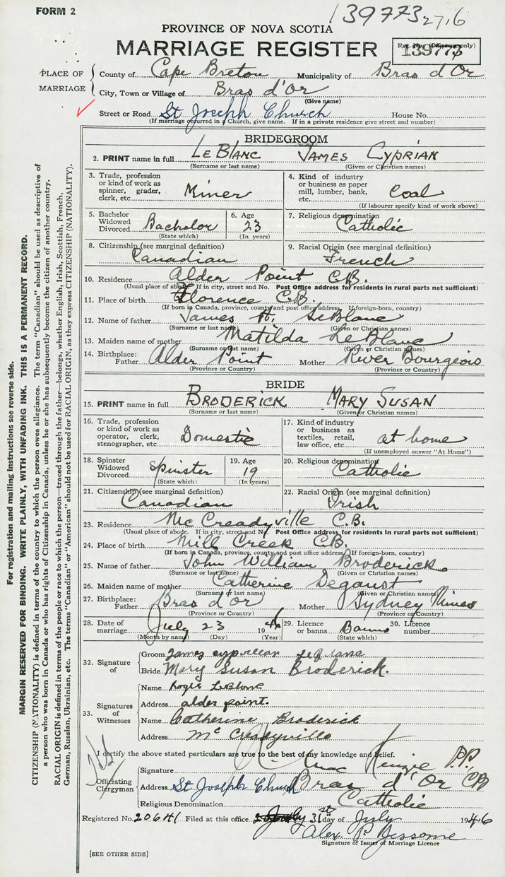 28. Date of marriage July 23 1946 29. By license or banns License 30. License number