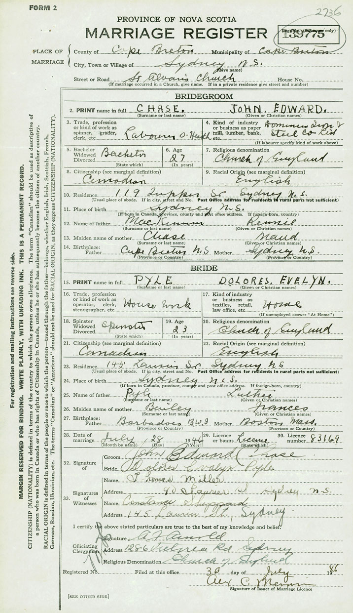 28. Date of marriage July 28 1946 29. By license or banns License 30. License number 83169