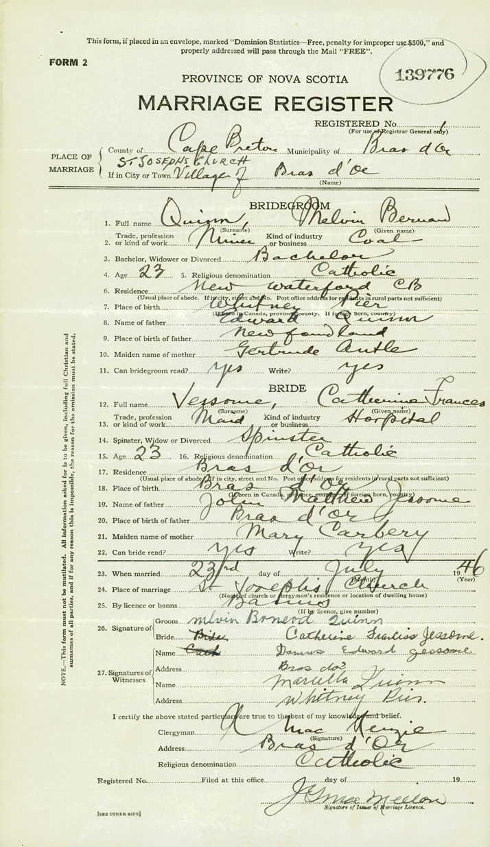 26. Place of marriage St. Joseph's Church Bras d'Or, Cape Breton County